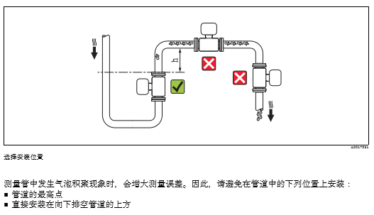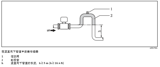 测量管中发生气泡积聚现象时,会增大测量误差。因此,请避免在管道中的下列位置上安装: • 管道的高点 • 直接安装在向下排空管道的上方 在竖直向下管道中安装 在竖直向下管道(h ³ 5 m (16.4 ft))中安装时,需要在传感器下游处安装虹吸管或泄放阀,避免抽压 时损坏测量管内衬。此外,还可以防止液体短暂停滞在测量管中,产生气障。