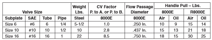 PARKER液压单向阀8000E系列可以2,3和4向手动切换,阀体零泄漏,可用于润滑的空气,液压油,和水。阀设计需要低驱动扭矩,并且可以在负载必须保持长时间和困难的条件下的应用中。8000E系列阀具有高污染的耐受性和长寿命,阀设计需要低驱动扭矩,面板式安装标准。